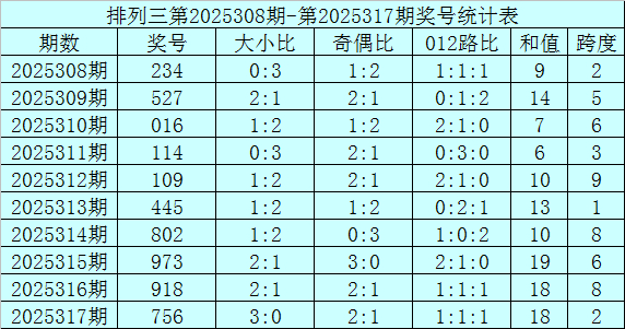 上期回归:陈设三第2025317期奖号为756,奖号012路比为1:1:1天津山里人网络科技有限公司,奇偶比为2:1,大小比为3:0,和值为18,跨度为2。